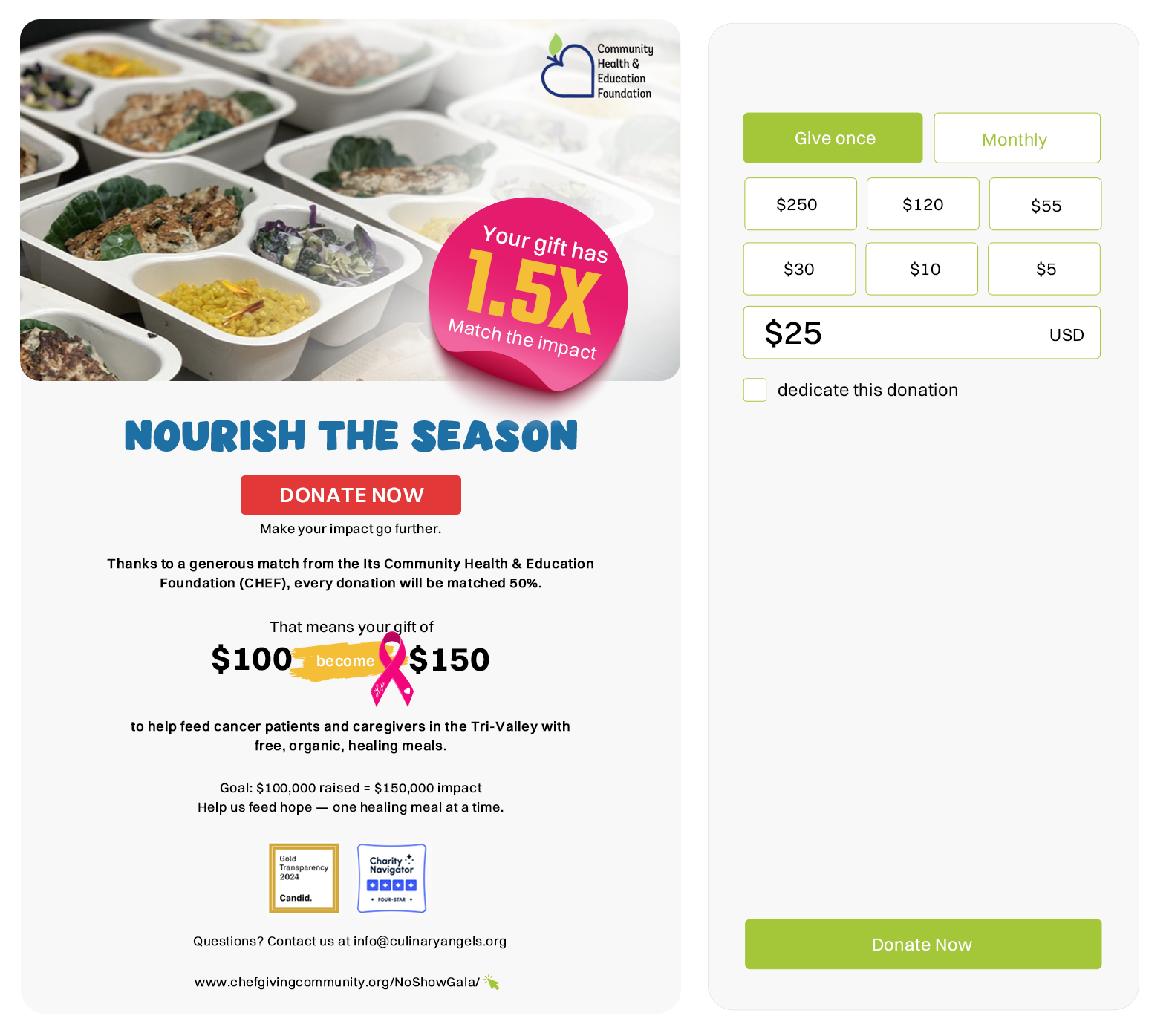 "Your support helps us serve nutrient-rich meals to cancer patients and caregivers across the Tri-Valley.Every dollar raised fuels healing, hope, and dignity.